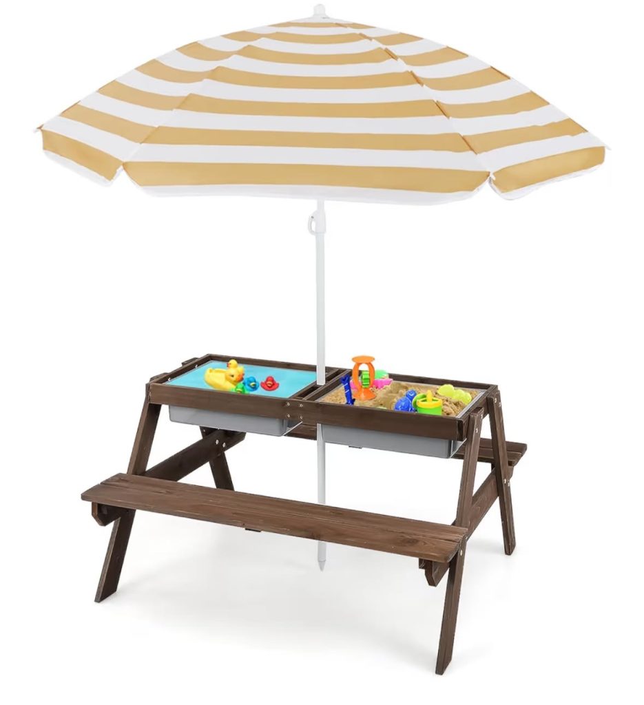 Made of cedar wood with removable bins and umbrella, it works for toddlers through early elementary.