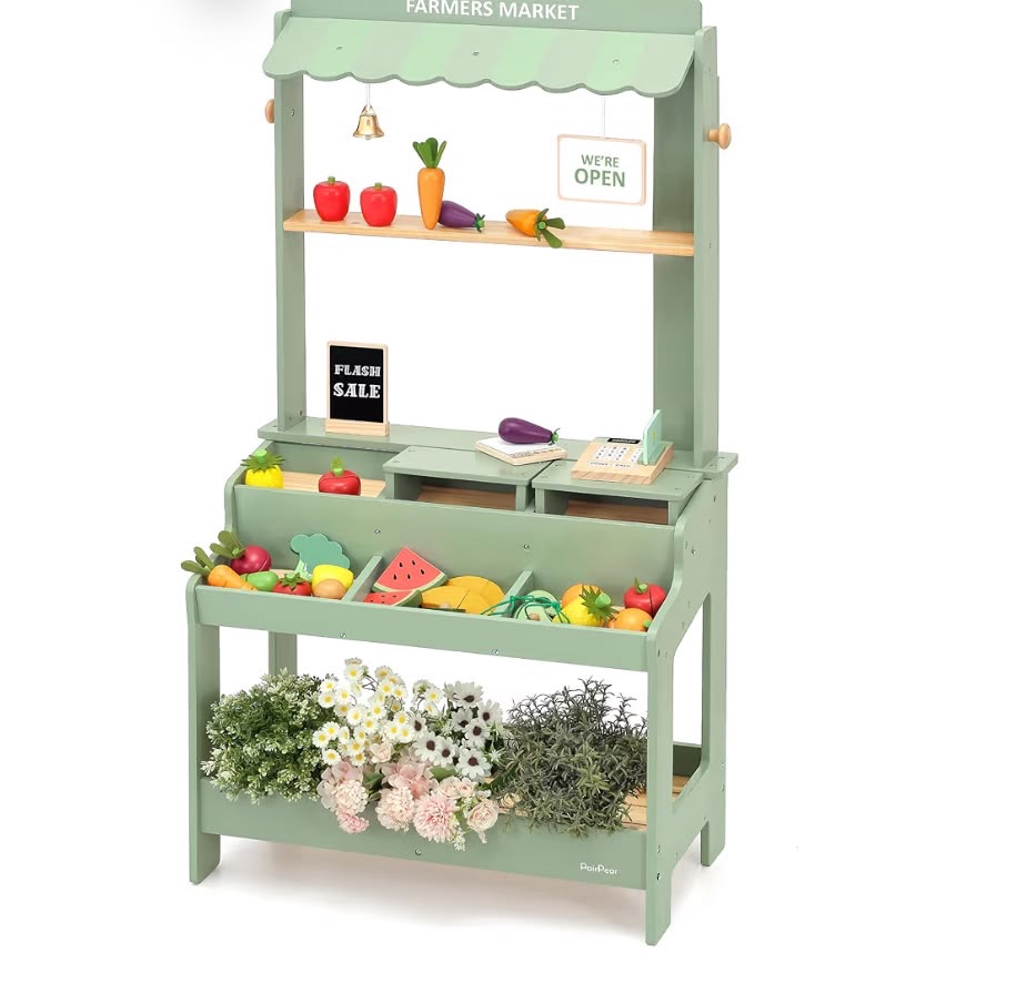 This 2-in-1 setup combines mud kitchen play with a farmers market stand.