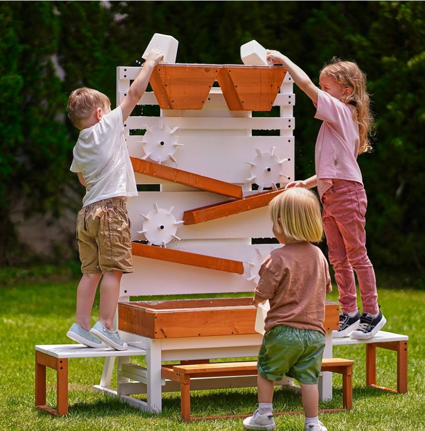 If you’re tired of small plastic water tables that get outgrown quickly — this larger wooden option lasts.