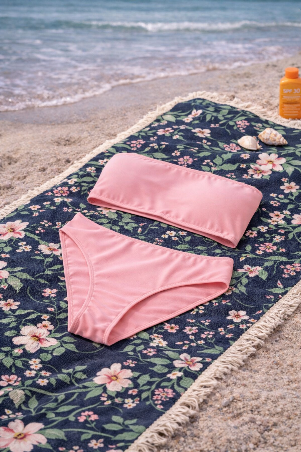 A chic bandeau bikini in soft Blush Pink, designed for effortless beach style and comfort. The elegant shade pairs beautifully with the Midnight Garden Seaside Collection for a coordinated summer look.