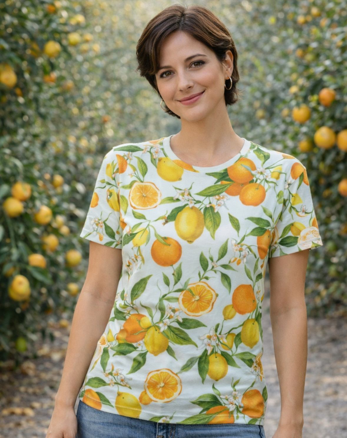 Fresh, bright, and full of sunshine, the Citrus Orchard Tee features a cheerful all-over print of oranges, lemons, and leafy branches. Inspired by warm days in the orchard, this playful design brings a burst of color and nature to your everyday wardrobe. Perfect for pairing with jeans, shorts, or your favorite casual layers. 🍊🍋🌿