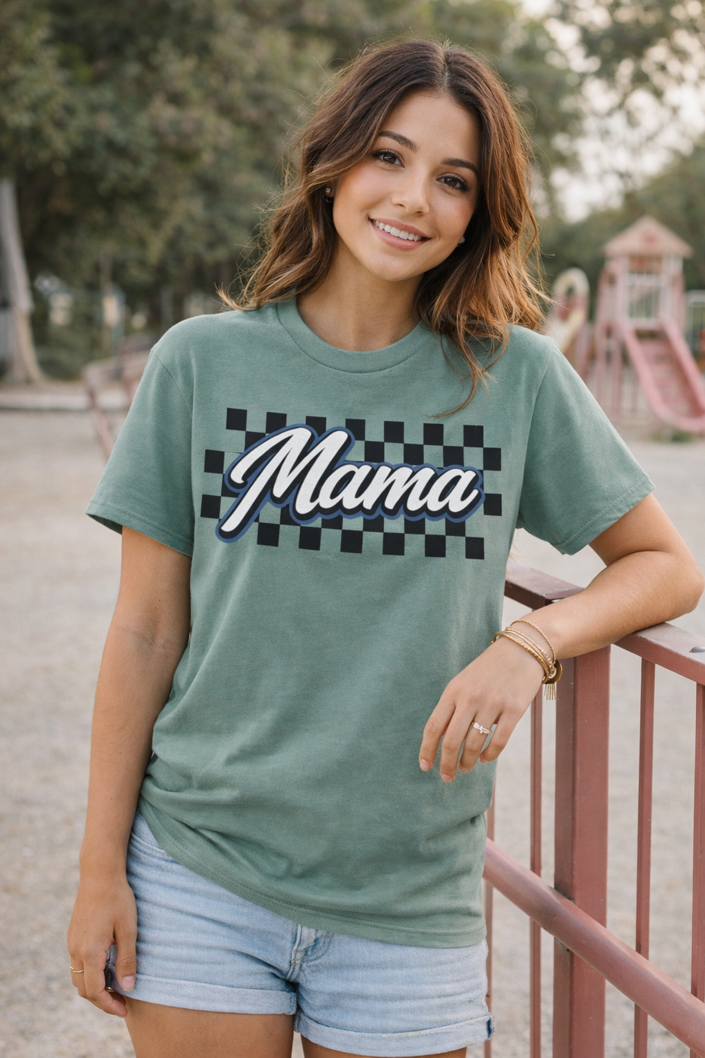 A vintage-inspired tee for moms who keep it cool and a little bit retro. Featuring a bold “Mama” script layered over a classic checkerboard design, this shirt pairs perfectly with denim, sneakers, or your favorite comfy mom uniform.